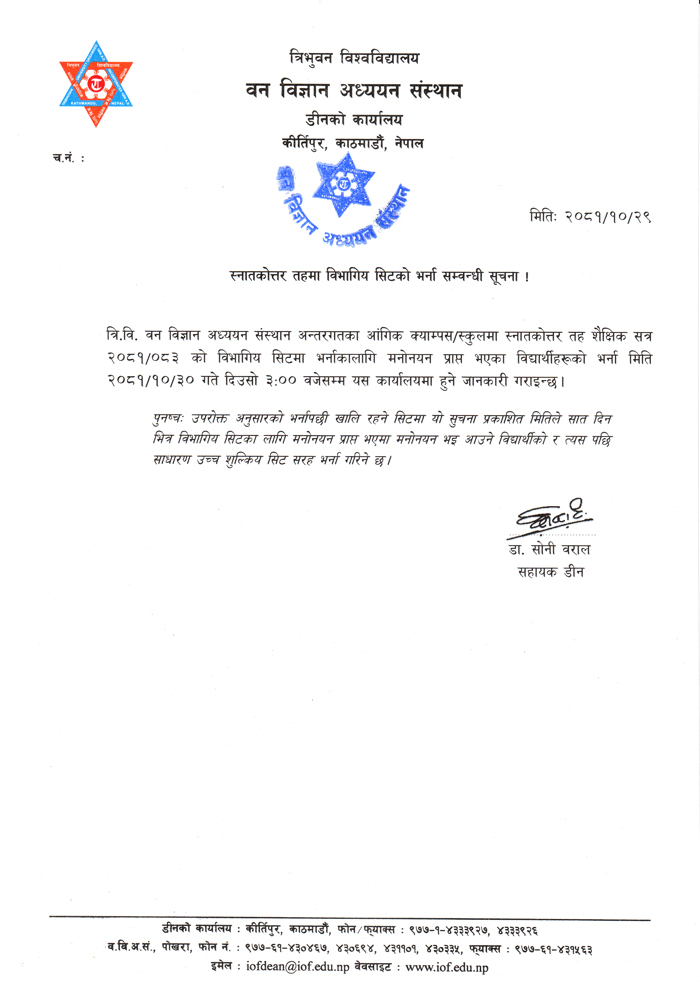 स्नातकोत्तर (M.Sc.) तह शैक्षिक वर्ष २०८१-०८३ विभागिय सिटमा भर्ना सम्वन्धी सूचना ।