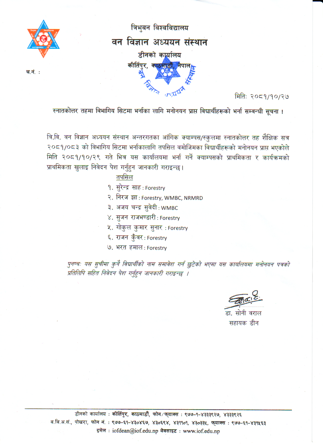 स्नातकोत्तर (M.Sc.) तह शैक्षिक वर्ष २०८१-०८३ विभागिय सिट सम्वन्धी सूचना ।