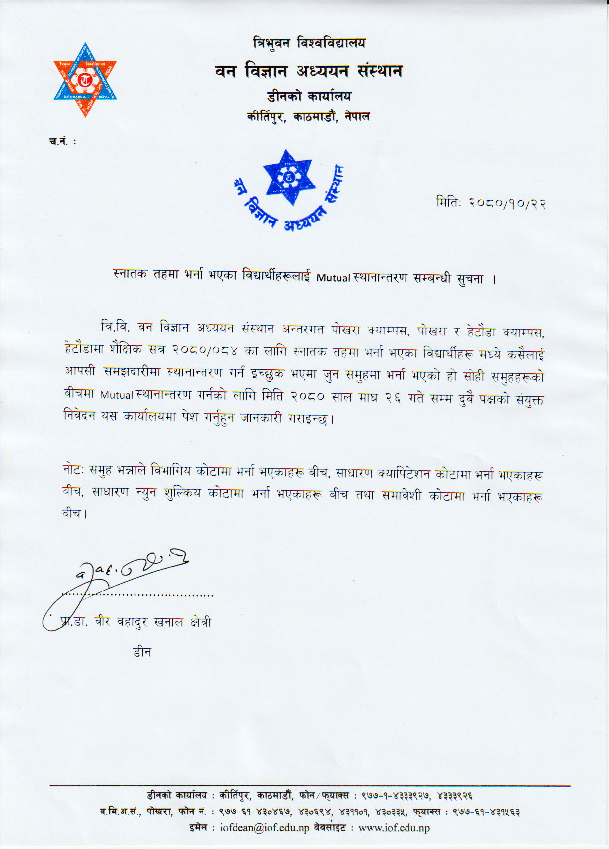 स्नातक तहमा भर्ना भएका विद्यार्थीहरूलाई Mutual स्थानान्तरण सम्बन्धी सुचना ।