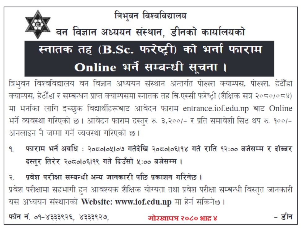 स्नातक तह प्रवेश परीक्षा २०८० को प्रवेश परीक्षा फारम भर्ने सम्वन्धी सुचना(B.Sc. Forestry Entrance 2080)