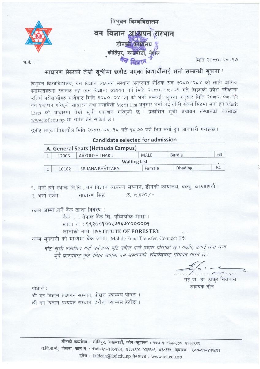 B.Sc. Entrance 2080 को साधारण सिटको खाली सिटमा भर्ना सम्वन्धि सूचना !