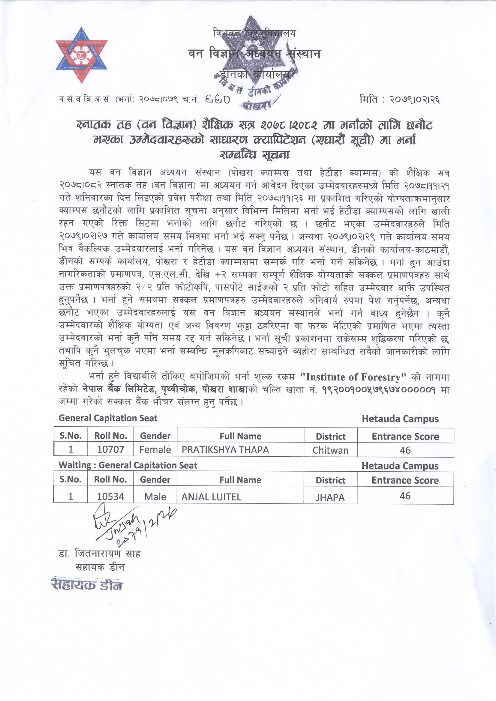 B.Sc. Entrance Examination, 2078 11th List: 2079/02/26