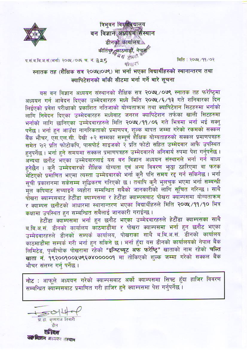 B.Sc. Entrance Examination Notice for Capitation and General Seats (2075/11/02)