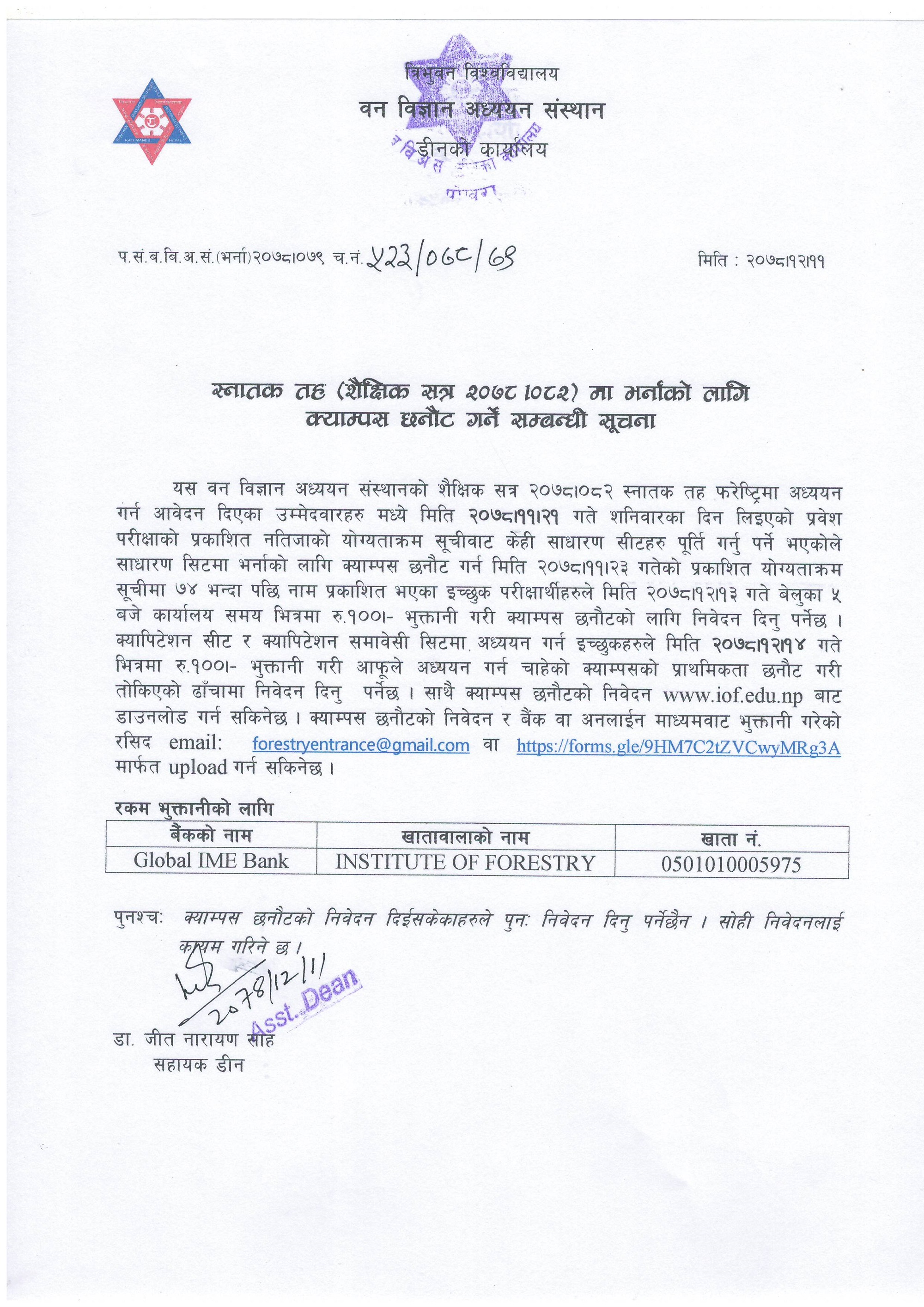 B.Sc. Entrance Examination Notice for Remaining Seats (2078/12/11)