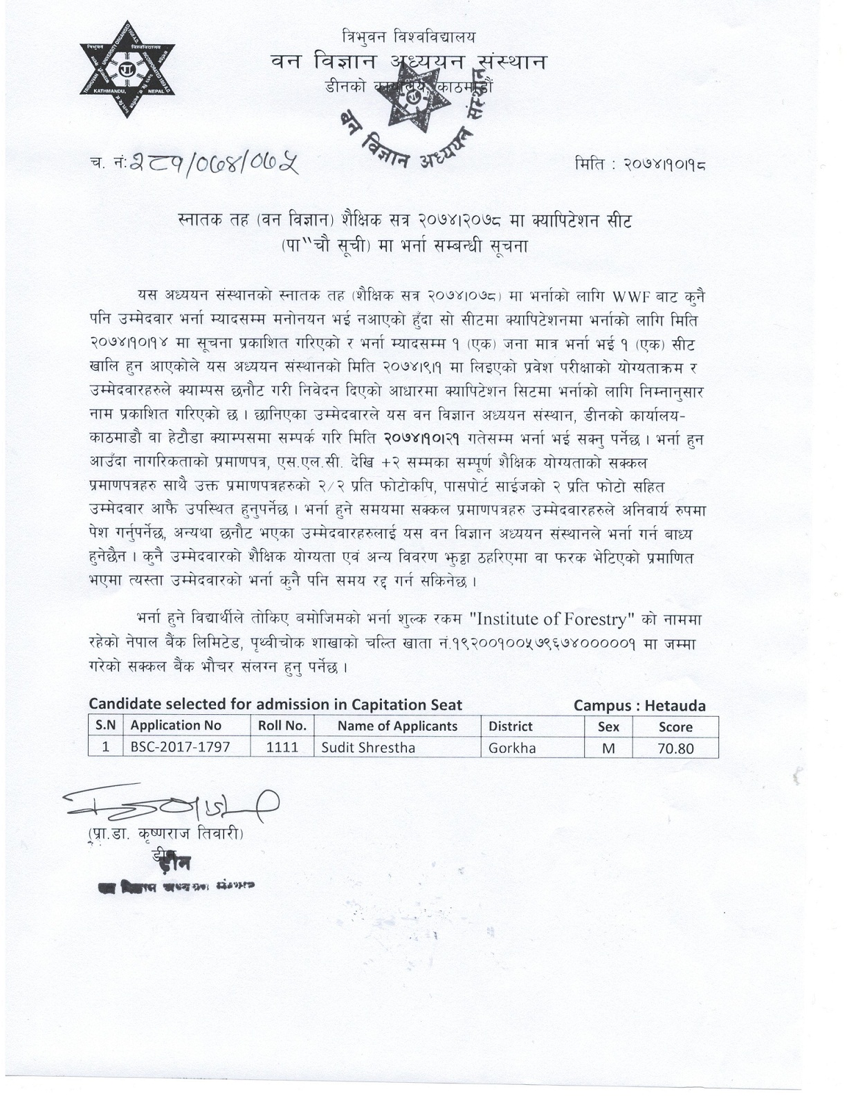 B.Sc. Forestry (2074-78 Academic Year) 5th Capitation List
