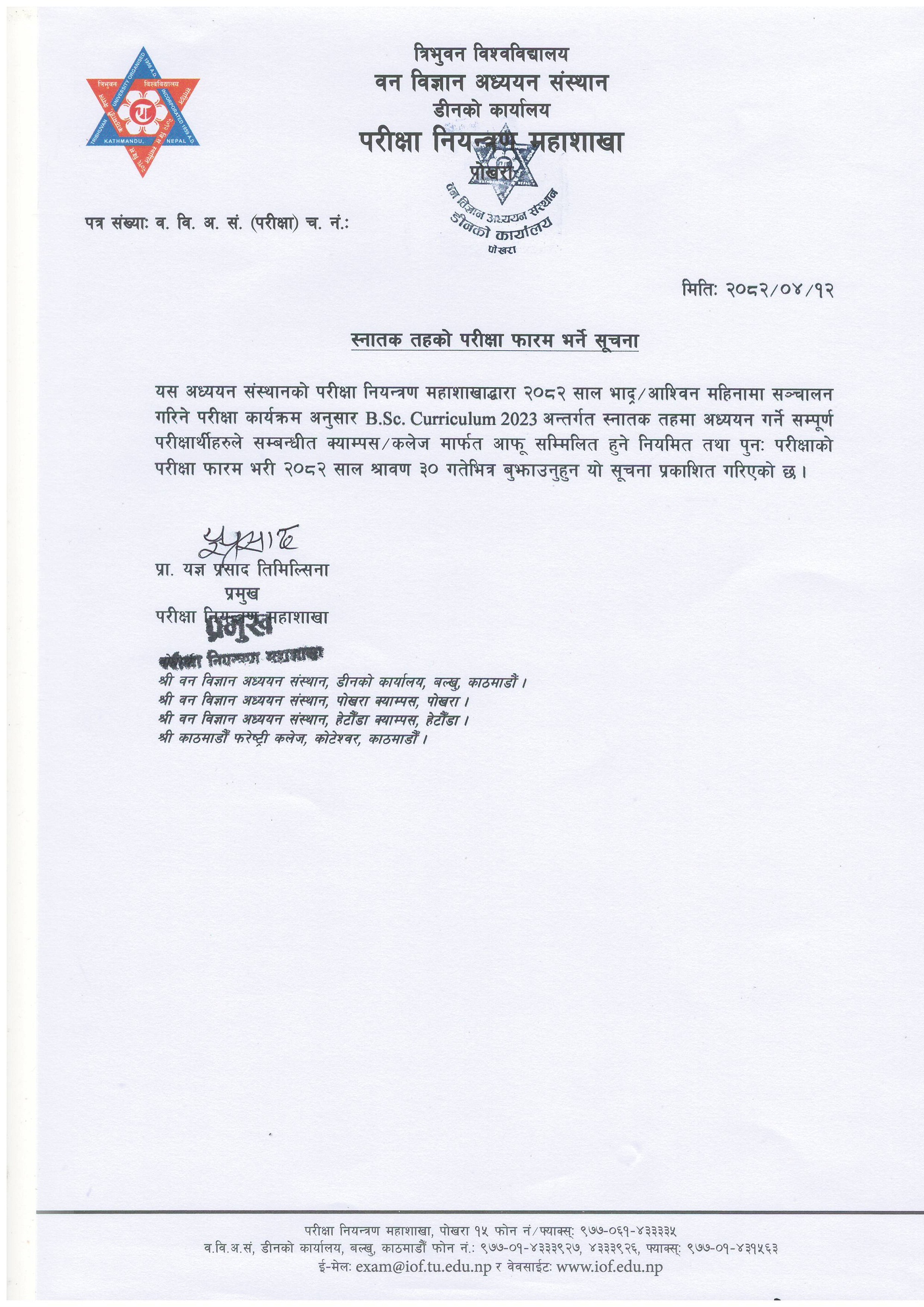 B.Sc. New course Examination Form Notice (2082/04/12)