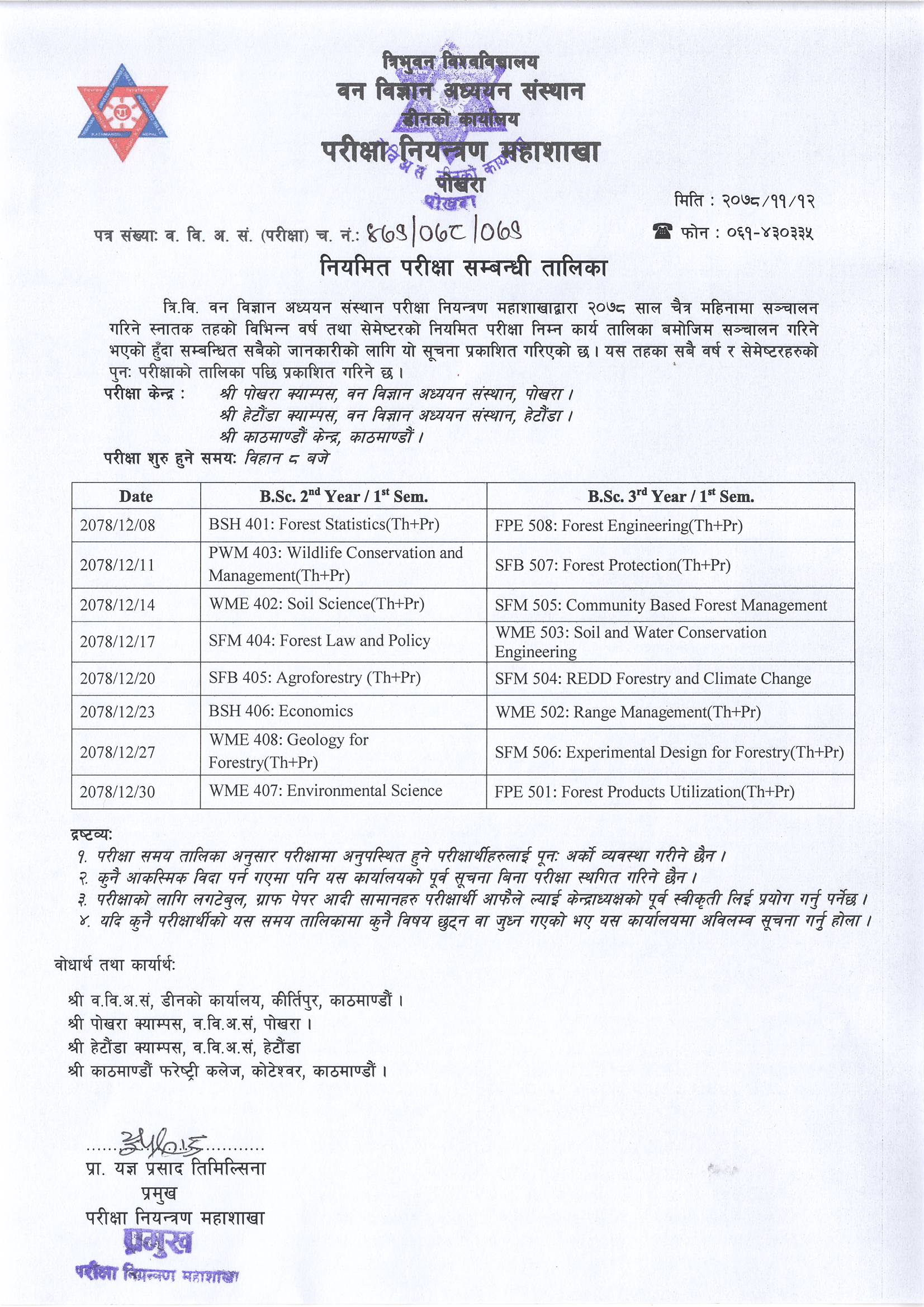 B.Sc. Regular Examination Routine for 2nd and 3rd Year (2078/11/12)