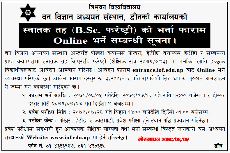 BSc Forestry(079-083 Batch) Entrance Form Open via Online Application 2079-06-05