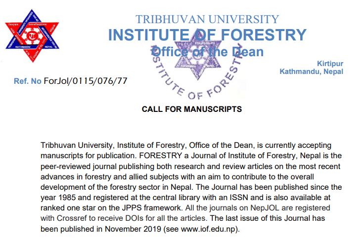 Tribhuvan University, Institute of Forestry, Office of the Dean, is currently accepting manuscripts for publication. FORESTRY a Journal of Institute of Forestry, Nepal is the peer-reviewed journal publishing both research and review articles on the most recent advances in forestry and allied subjects with an aim to contribute to the overall development of the forestry sector in Nepal. The Journal has been published since the year 1985 and registered at the central library with an ISSN and is also available at ranked one star on the JPPS framework. All the journals on NepJOL are registered with Crossref to receive DOIs for all the articles. The last issue of this Journal has been published in November 2019 (see www.iof.edu.np).