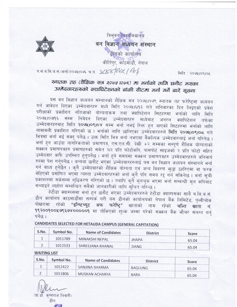 Candidates Selected for remaining Seats of Hetauda Campus in General Capitation Seat (2075/09/05)