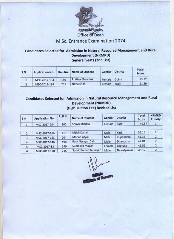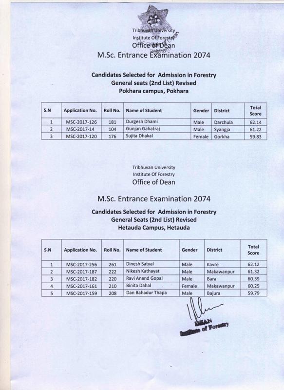Candidates Selected for Admission in Forestry General Seats (2nd List) in Pokhara & Hetauda