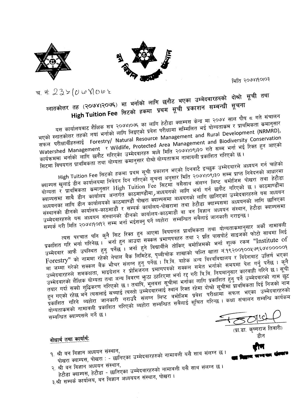 Candidates Selected for Admission in Forestry (High Tuition Fee) Pokhara & Hetauda