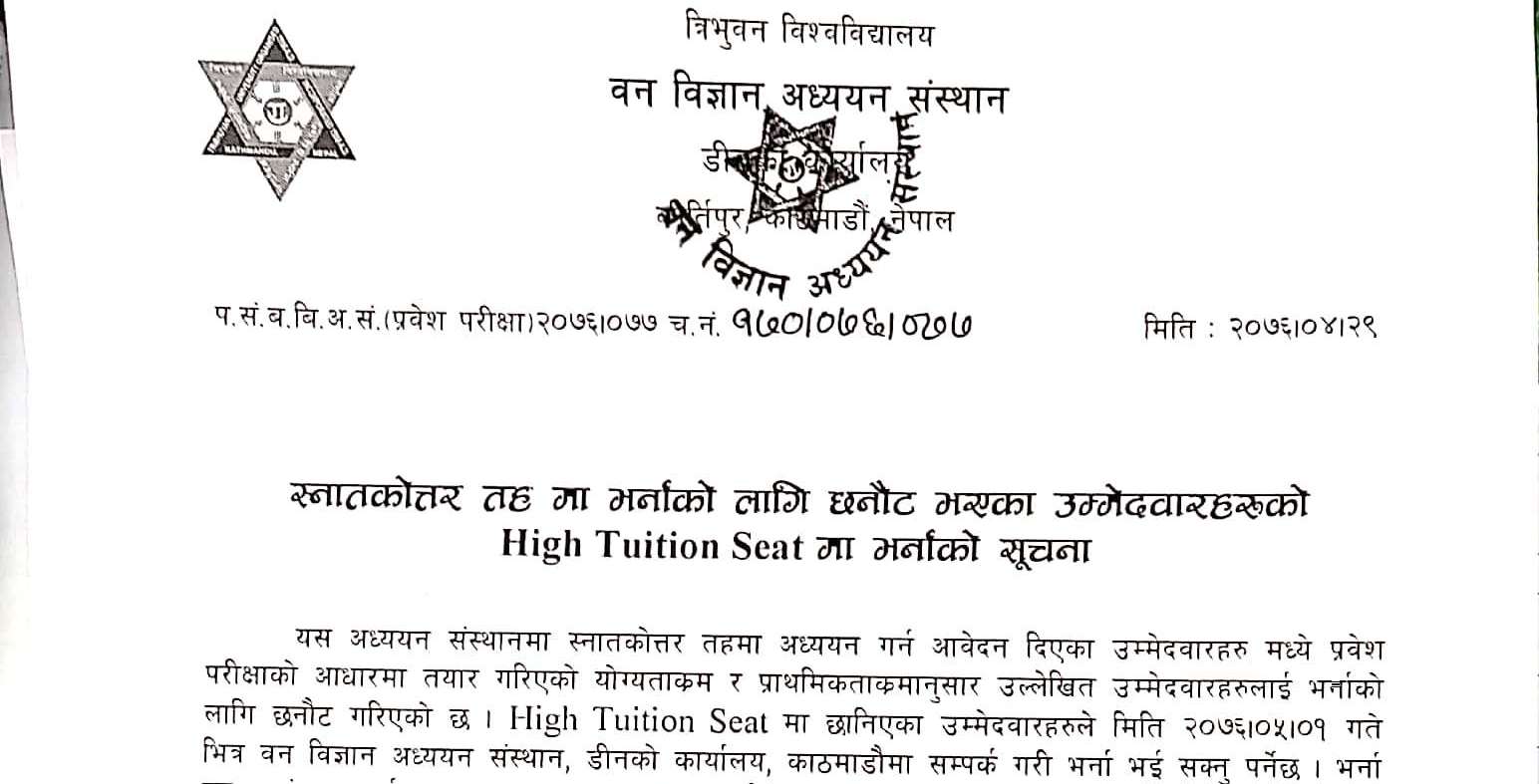 M.Sc. Entrance Examination 2076 Notice for Remaining Seat (2076/04/29)