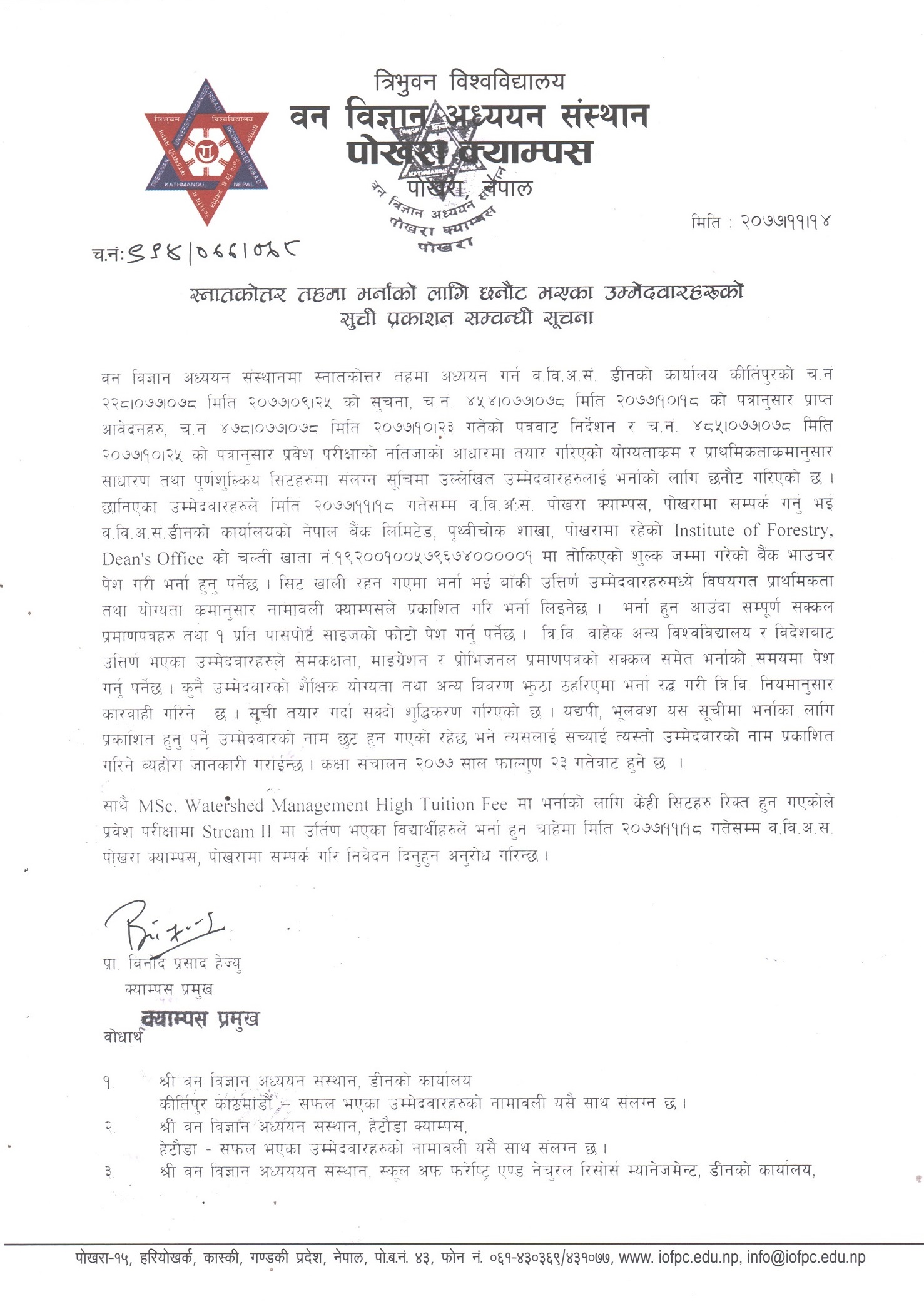 M.Sc. Entrance Result - 4th High Tuition List & 5th Low Tuition List - Pokhara Campus