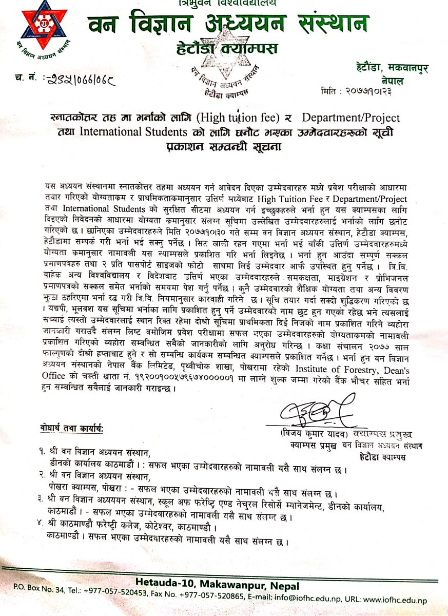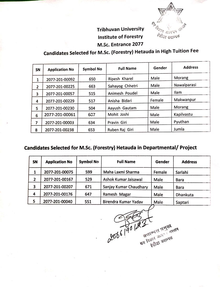 M.Sc. Entrance Result 2077 - 1st General and Second High Tuition Fee List - SOFNRM