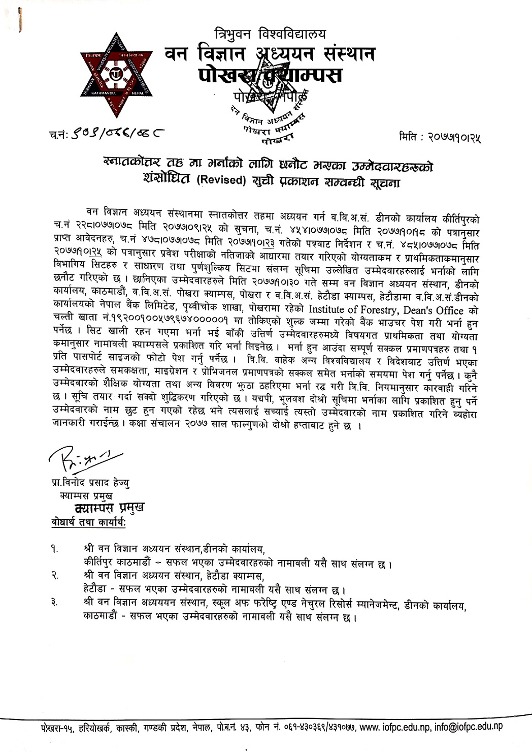 M.Sc. Entrance Revised Result - Forestry General/Capitation and All Stream Department/Project Seat