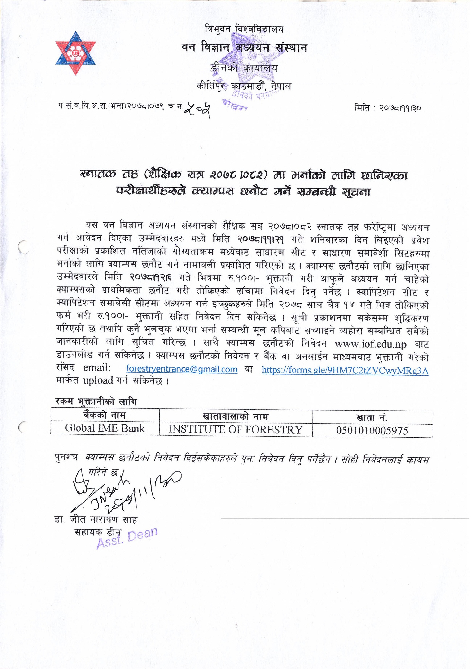 Notice for Selected Candidates in B.Sc. Entrance Examination, 2078