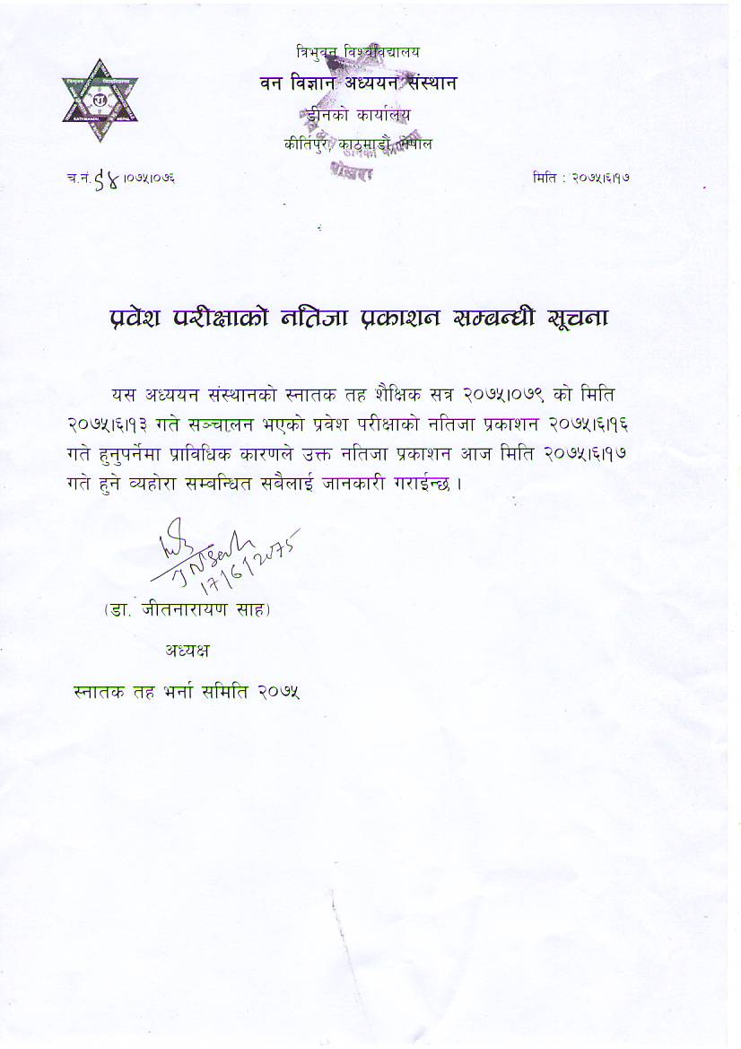 Notice of B.Sc. Forestry Entrance Result